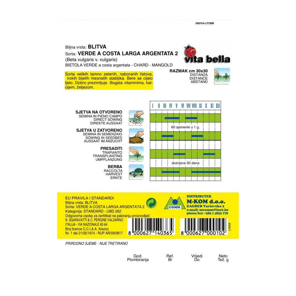 Sorta velikih tamno zelenih, naboranih listova, širokih bijelih mesnatih stabljika. Bere se cijelo ljeto. Dobro prezimljuje. Bogata vitaminima, kacijem, željezom. Prirodno sjeme – nije tretirano. Pakiranje: vrećica 11 x 16 mm, težina varira ovisno o vrsti sjemena