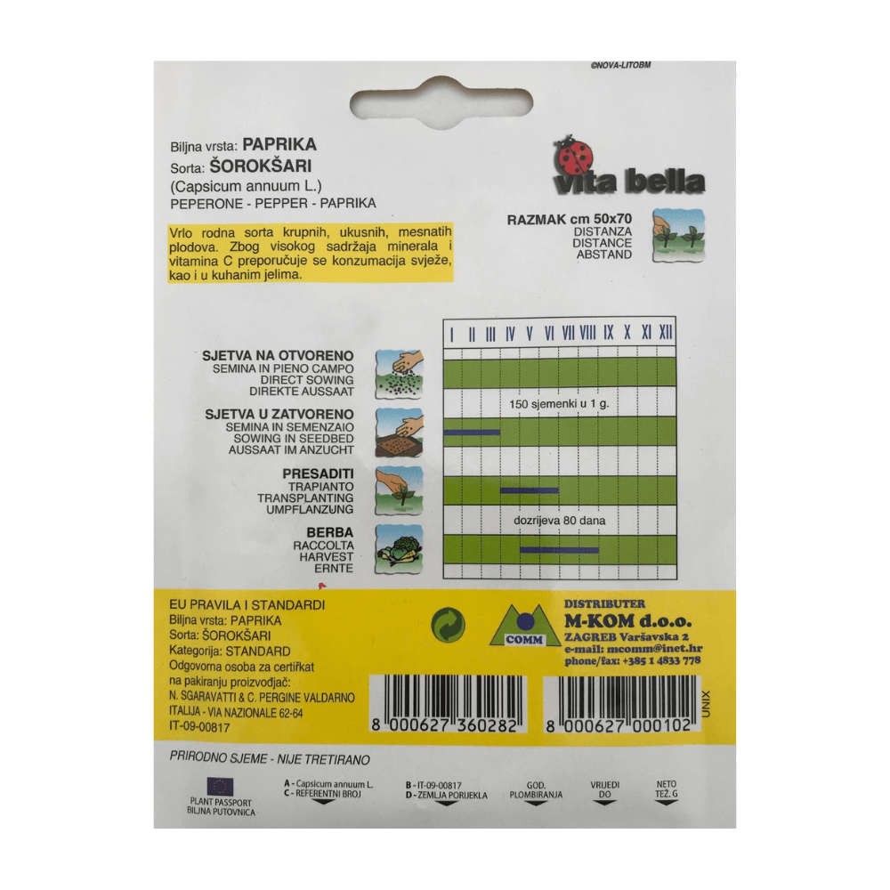 Kasna sorta “babura” paprike. Plodovi su žuti, slatki i ukusni, pogodni za neposrednu upotrijebu, kiseljenje ili punjenje. Dobro uspjeva u susjedstvu salate, špinata i rotkvice, slabije u susjedstvu graha. Prirodno sjeme – nije tretirano. Pakiranje: vrećica 11 x 16 mm, težina varira ovisno o vrsti sjemena